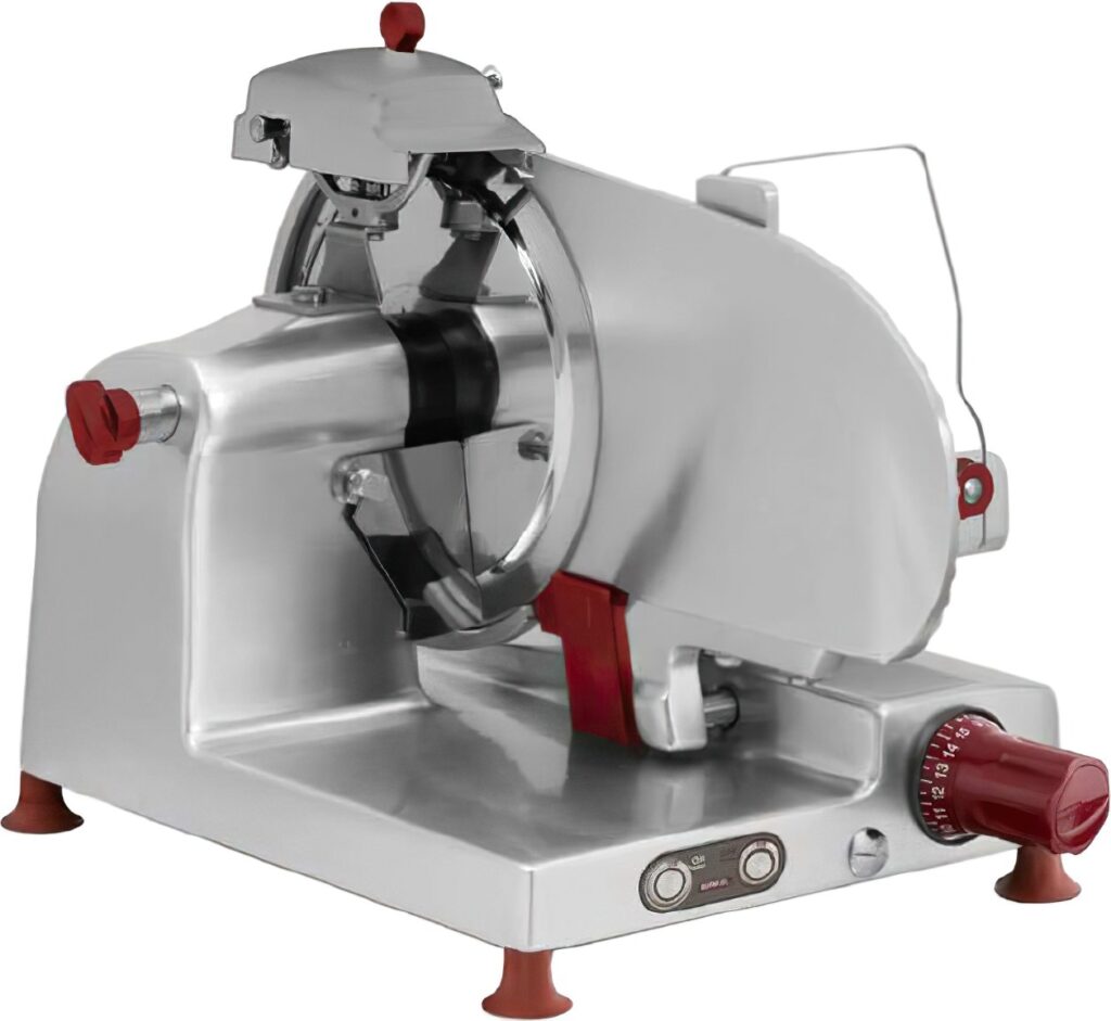 Imaginez une trancheuse à volant, véritable œuvre d’art mécanique, qui coupe une charcuterie avec une précision et une élégance inégalée.