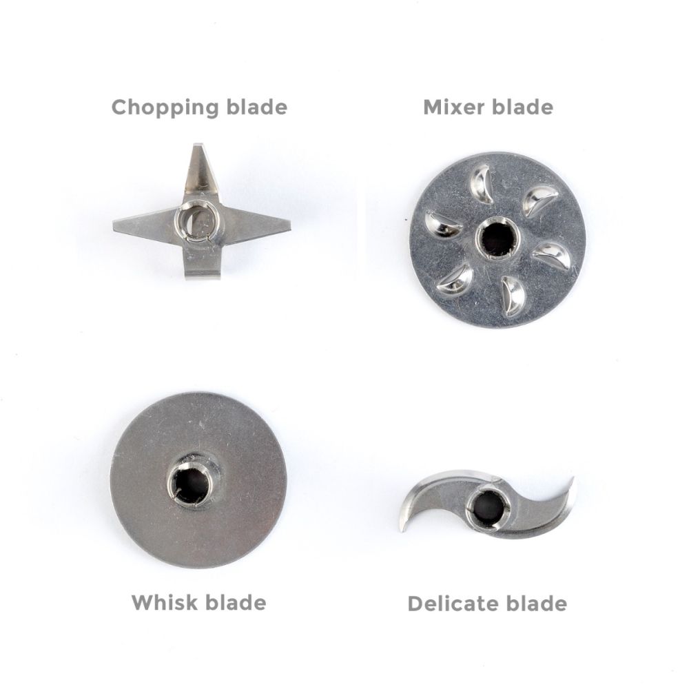 – Lame hachoir : couteau polyvalent pour hacher, couper et broyer tout, même les aliments congelés et les glaçons. Il peut être utilisé directement dans des casseroles sur la cuisinière, sans avoir besoin d’autres récipients.