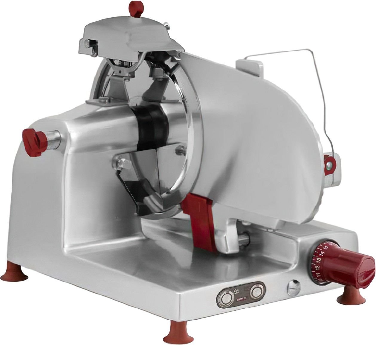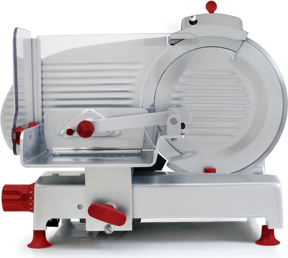 Petite machine de découpe avec un seul compartiment. Le manche à viande en aluminium unique à prise souple offre un support plus fin pour le produit à couper et est donc idéal pour la viande, les saucisses et le fromage. La came progressive garantit une précision millimétrique dans la première phase d’ouverture avec des réglages en dixièmes de millimètre. pour des tranches extrêmement fines et en même temps une configuration rapide pour des tranches plus larges.