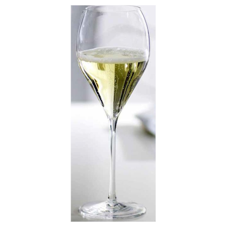 Coupelle Arrondie : Sa forme en tulipe, assez large au milieu, permet au vin de s’oxygéner et aux arômes complexes (levure, brioche, fruits) de s’épanouir.
