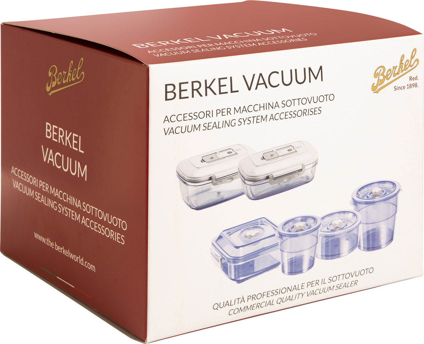 Pour utiliser au mieux Vacuum, Berkel propose une gamme complète d’accessoires. Des sachets et des rouleaux mais également des conteneurs rigides, selon des formes et des mesures différentes. Ces boîtes compatibles sont équipées d’un couvercle avec une vanne spéciale pour créer un sous-vide sans aspirer les liquides, afin de préserver la pompe.