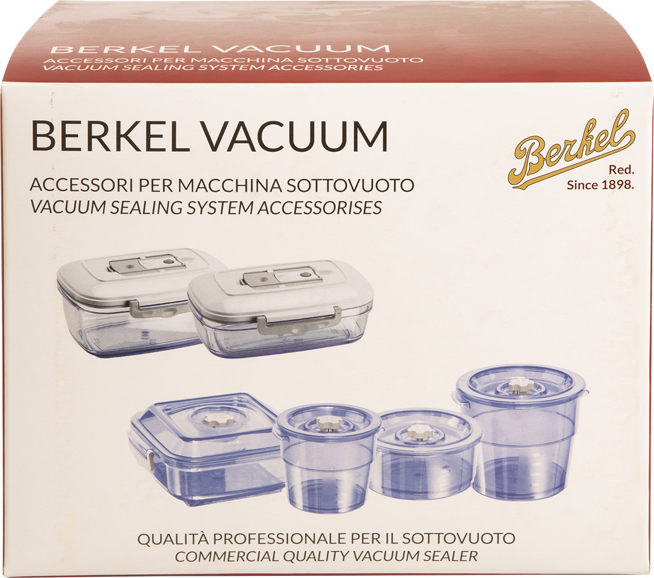 Pour utiliser au mieux Vacuum, Berkel propose une gamme complète d’accessoires. Des sachets et des rouleaux mais également des conteneurs rigides, selon des formes et des mesures différentes. Ces boîtes compatibles sont équipées d’un couvercle avec une vanne spéciale pour créer un sous-vide sans aspirer les liquides, afin de préserver la pompe.